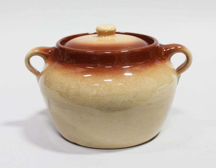 Beige to brown gradient Medalta bean pot with lid and double loop handle The pot has a 4.5 in. diameter matching lid with crazing to the underside. The pot is stamped 'Medalta' to the base and has general crazing.