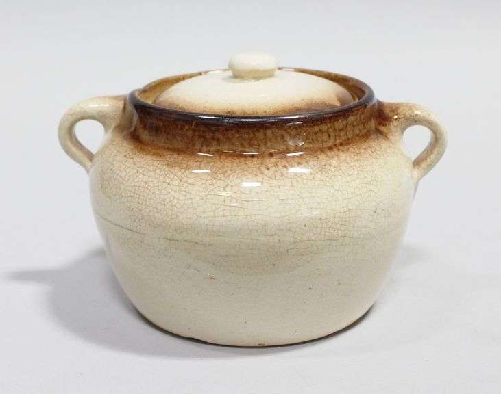 Cream to brown gradient Medalta bean pot with matching lid and double loop handle. The pot has a 4.25 in. diameter lid. The pot has general crazing, and is stamped 'Medalta' to the base.