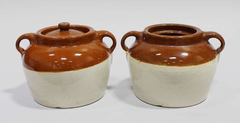Two 1 quart two-toned stoneware bean pots with an impressed lid and double small loop handles. One pot is missing a lid, the other pot has a 3 in. diameter lid with a '1' on the button knob handle. The pots are impressed with a '1' to the bottom of the base.