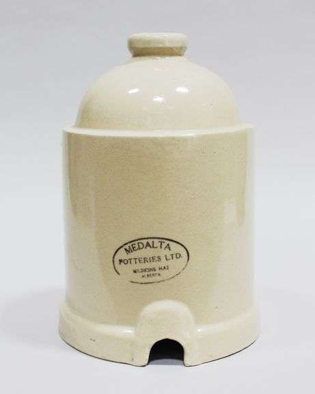 Medalta Potteries stoneware chicken feeder lid. The lid is stamped 'Medalta potteries Ltd. Medicine Hat'. Underplate not included. The feeder has signs of crazing.