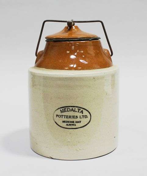 Two-toned Medalta Potteries crock with wire clamp lid. The crock is stamped 'Medalta Potteries Ltd. Medicine Hat Alberta' to one side.