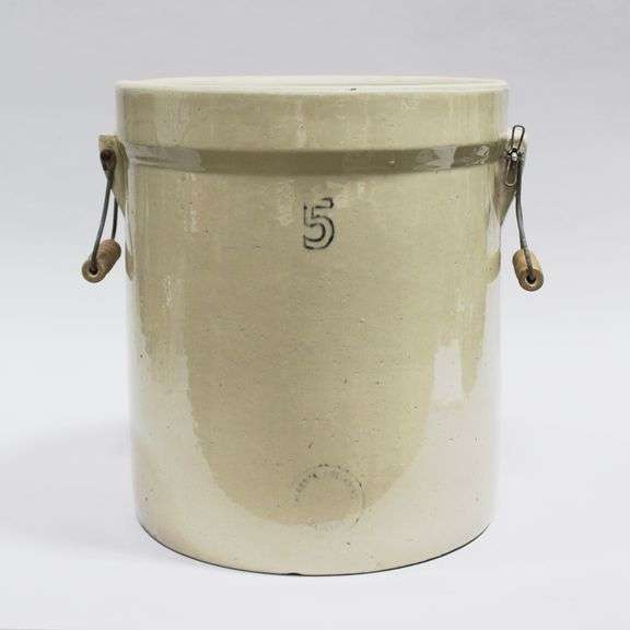 A 5 gallon glazed stoneware crock with wire handles and wooden grips. The crock is stamped ‘Alberta Potteries Redcliff’ on one side and the base is impressed with a '5'.