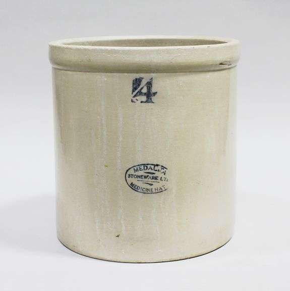 Glazed open stoneware Medalta 4 gallon crock. The crock is stamped ‘Medalta Stoneware Ltd.’ to the front and is impressed with a ‘4’ to the underside.