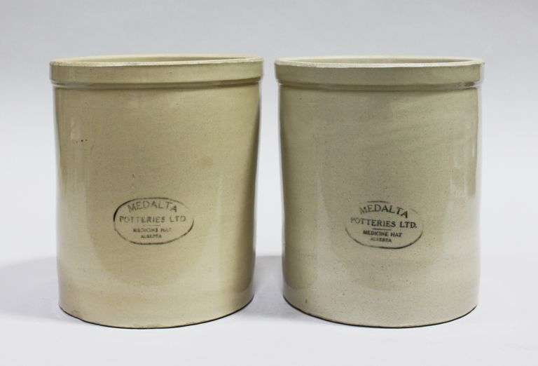 Open Medalta Potteries stoneware crocks. Both crocks are stamped 'Medalta Potteries Ltd. Medicine Hat Alberta'.