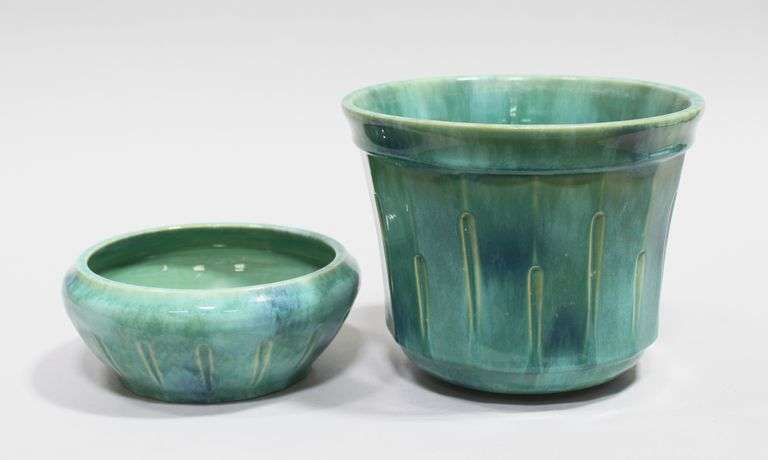 Turquoise glazed Medalta bowl and planter with fluted pattern. The planter has a small chip to the base and is impressed ‘Medalta Polygon No. 23 -8.’ The bowl has a rolled rim and is impressed ‘Medalta Polygon 21/5.’
