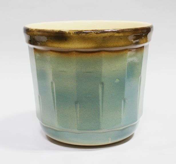 Two-toned glazed Medalta planter, with brown rim into teal coloring. The planter has two hairline cracks running from the rim downwards. The base is stamped ‘Medalta Potteries Redcliff, Alta.’