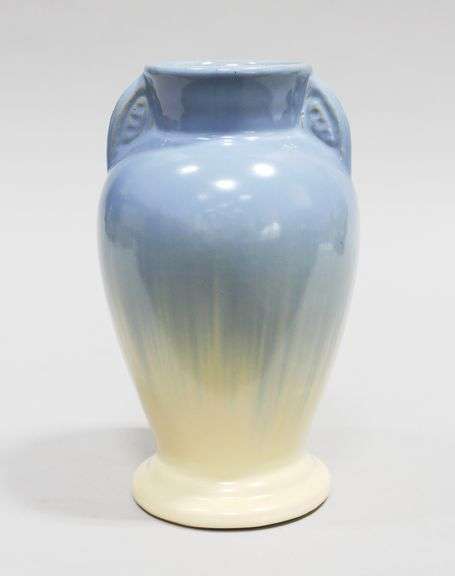 Light blue into cream Medalta Potteries vase with conjoined handles and wide base. The base is stamped ‘Medalta Potteries,’ with signs of crazing along the base