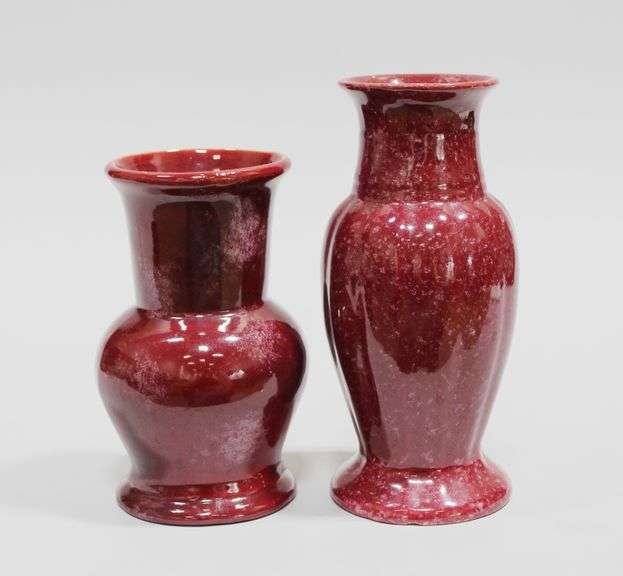 Red glazed, white textured Medalta vases. A bulb vase with light repair to the flared rim, the base of which is stamped ‘Medalta Potteries.’ The baluster vase has a small chip to the base and is stamped ‘Medalta made in Canada.’