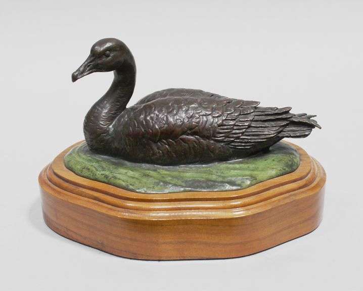 DON TONEY, BRONZE SWANCanadian [b. 1954]Swan on a stone and wood base.Size: 6 x 9 x 8.5 in. (overall)