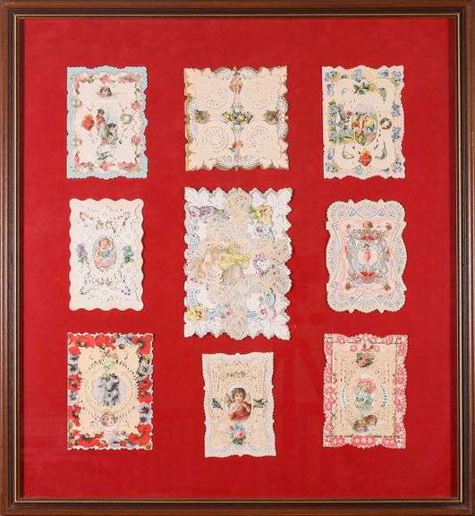 A collection of nine vintage "Lace" die cut greeting card covers. Mounted to a red suede backing and framed under glass.