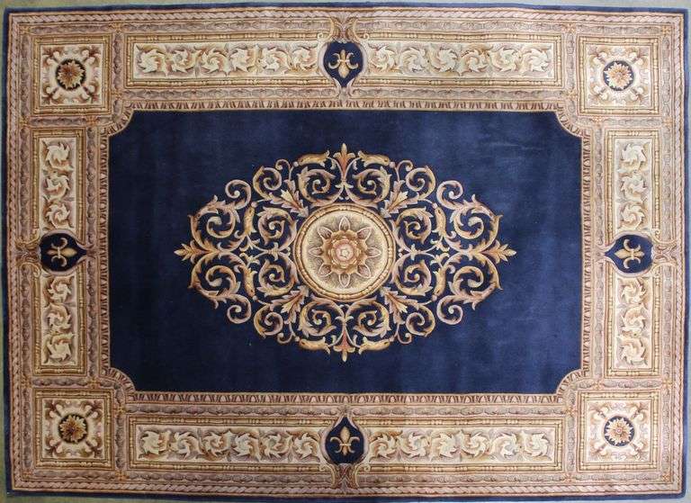 Hand knotted wool carpet with central floral medallion over a blue ground and featuring fleur-de-lis decoration.