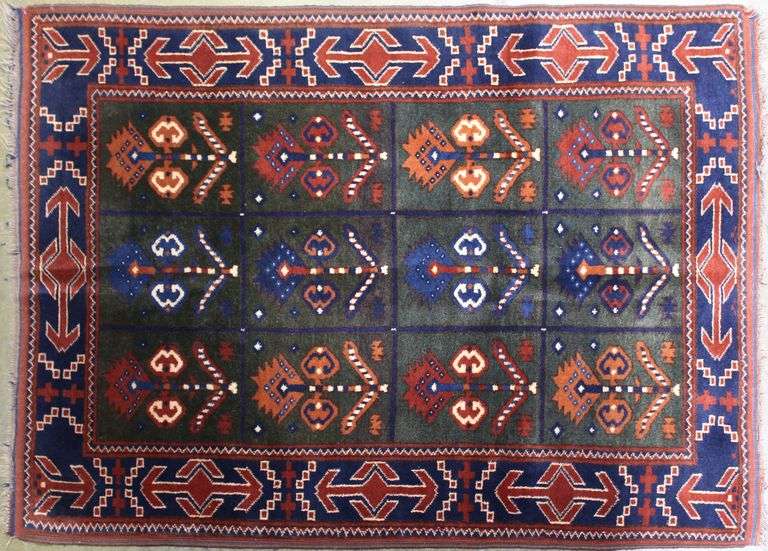 Hand knotted wool carpet in blue and green over a rust ground. With floral and arrow pattern.
