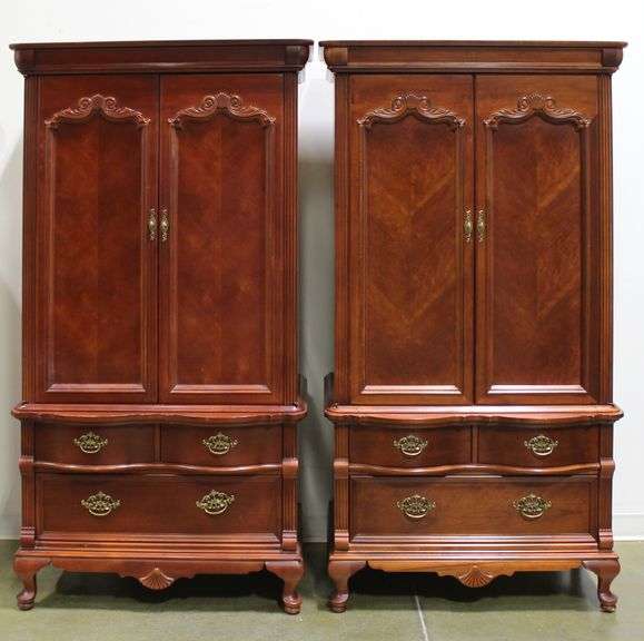 Two late 20th century traditional entertainment units with upper storage and two lower full size drawers. The pieces have smoke damage, a repaired leg, and cable management cutouts to the back.