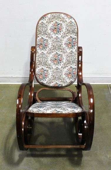 Bentwood rocking chair with patterned seat and back.