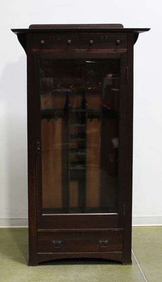 By Charles P. Limbert Co., Allentown, PA. Circa 1900-1910. Quarter sawn oak with dovetail joinery, original hardware, fitted interior with hanging hooks and storage drawers.