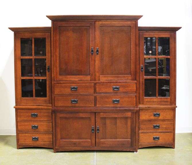 A Mission / Art & Crafts style oak wall unit with central upper cupboard above a bank of four dovetailed cedar lined drawers and cabinet base, flanked by side cabinets featuring glazed upper bookshelf display above banks of three drawers.