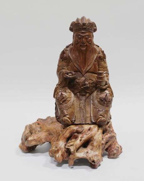 CHINESE CARVED SCULPTURECarving of an elder seated on a burl wooden stand.Height: 18.5 in. (including stand)