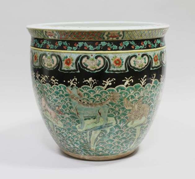 CHINESE PORCELAIN FLOOR PLANTERDecorated with eight Chinese traditional mythical sea creatures.Size: 14 x 16 in.