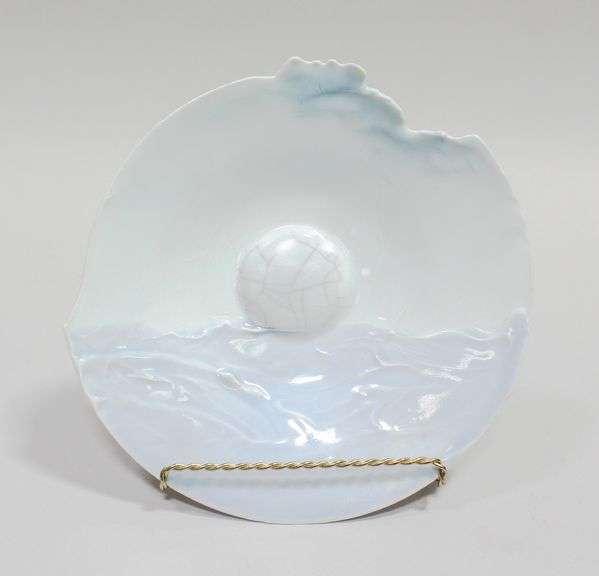 A 1980s pedestal celadon plate with organic edge. Artist signature to the underside.
