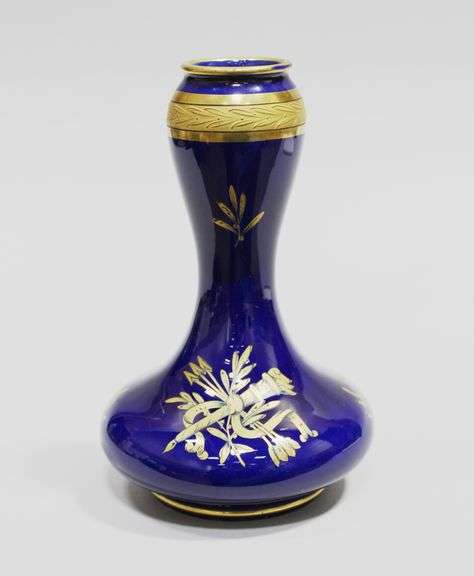 A vase with flared body and high bulbous collar, adorned with gilded laurel wreath, flowering branches, and a torch with a quiver. Some age related loss to the gilding and minor scratching to the finish. Stamped to the underside.