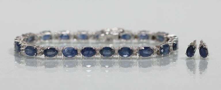 An unmarked silver bracelet set with oval sapphires and diamonds and a pair of sapphire and diamond stud earrings set in marked sterling silver.