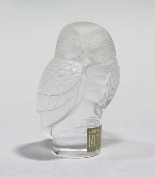 A frosted owl figure perched on a clear crystal base. With etched signature and bearing paper label.