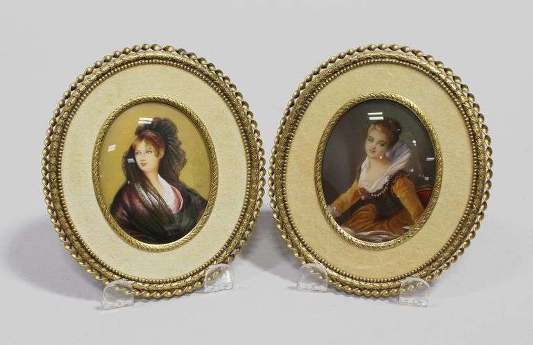 Two Italian brass and velvet oval picture frames featuring portraits of Madame Brillon de Jouy and Dona Isabel de Porcel. Stamped "Made in Italy" to the back.
