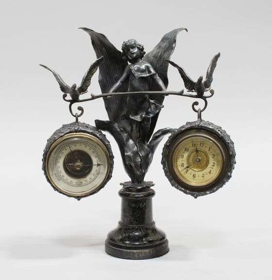 Depicting a cherub with wings and balancing two birds. Resting on a stepped marble plinth. With a suspending barometer and clock.