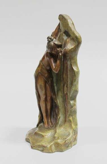 Figural bronze depicting a woman wearing a partial gown, drinking from a spring waterfall. Signed "L & F Moreau" to the back. With a repair to one finger.